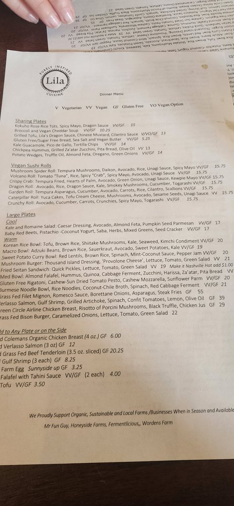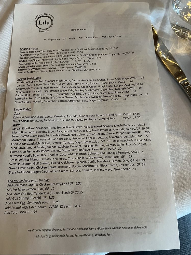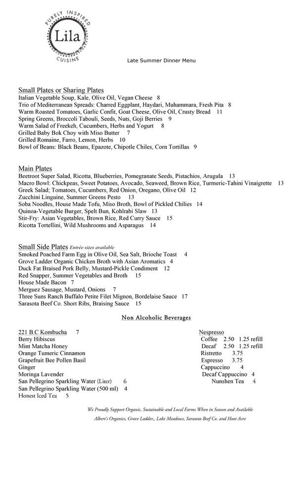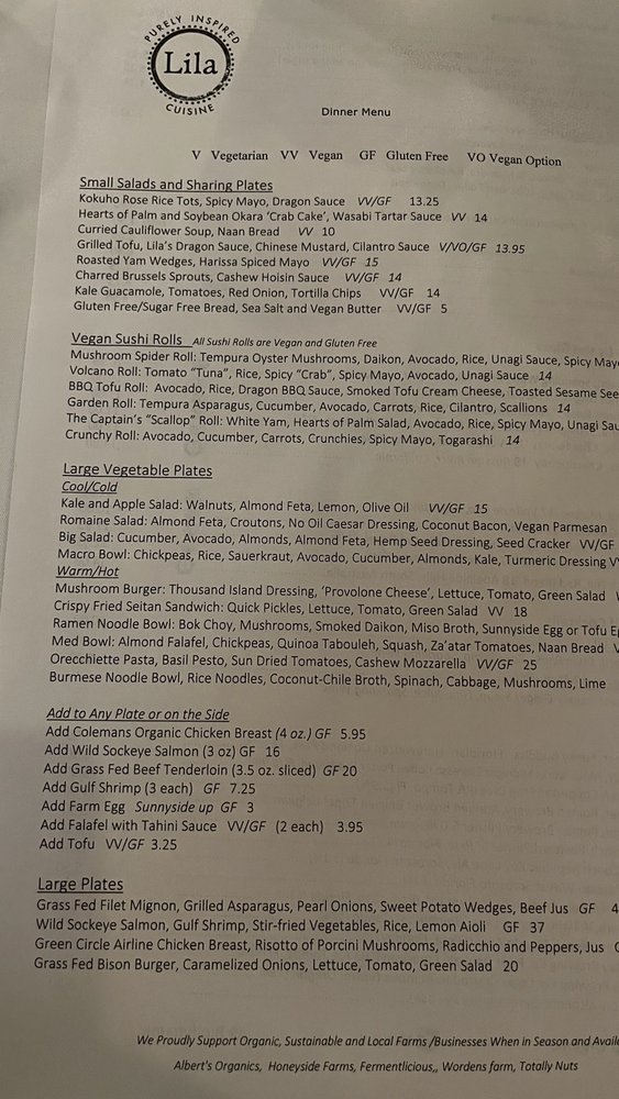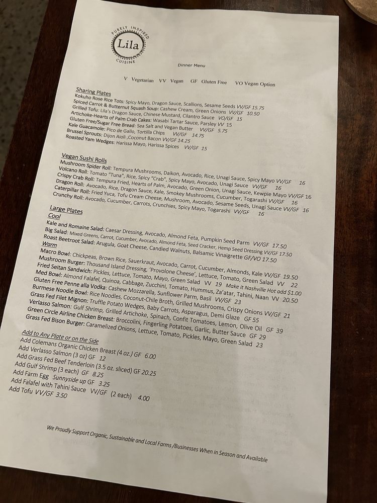 Welcome to Lila, a culinary gem situated at 1576 Main St in Sarasota, Florida. This New American restaurant masterfully balances freshness and creativity, showcasing a menu that tantalizes the taste buds of both vegans and carnivores alike. Lila offers a variety of carefully crafted dishes, from grilled tofu drizzled in flavorful sauces to the standout beef tenderloin. For those seeking something lighter, the kale guacamole and roasted yams are must-tries.